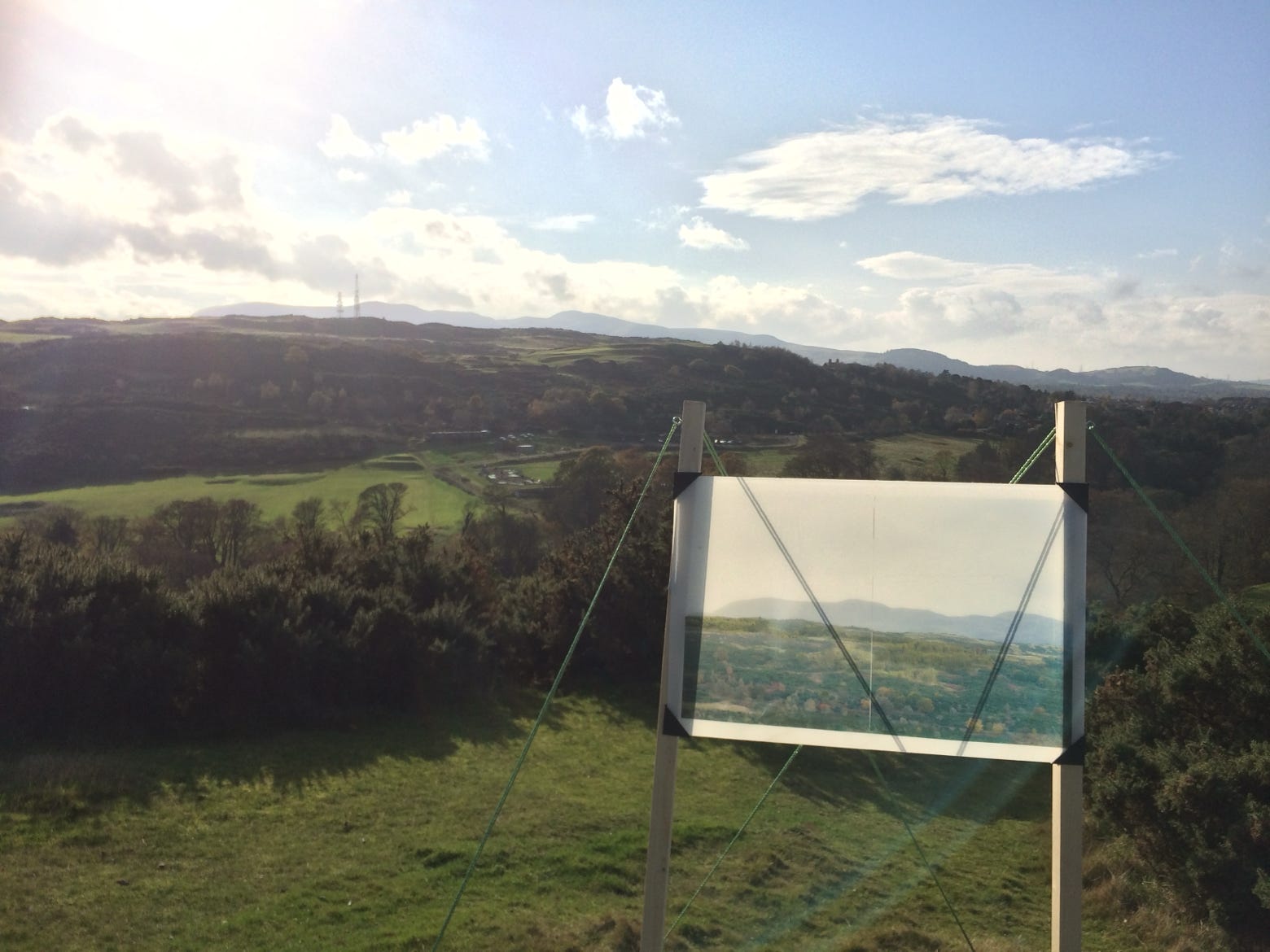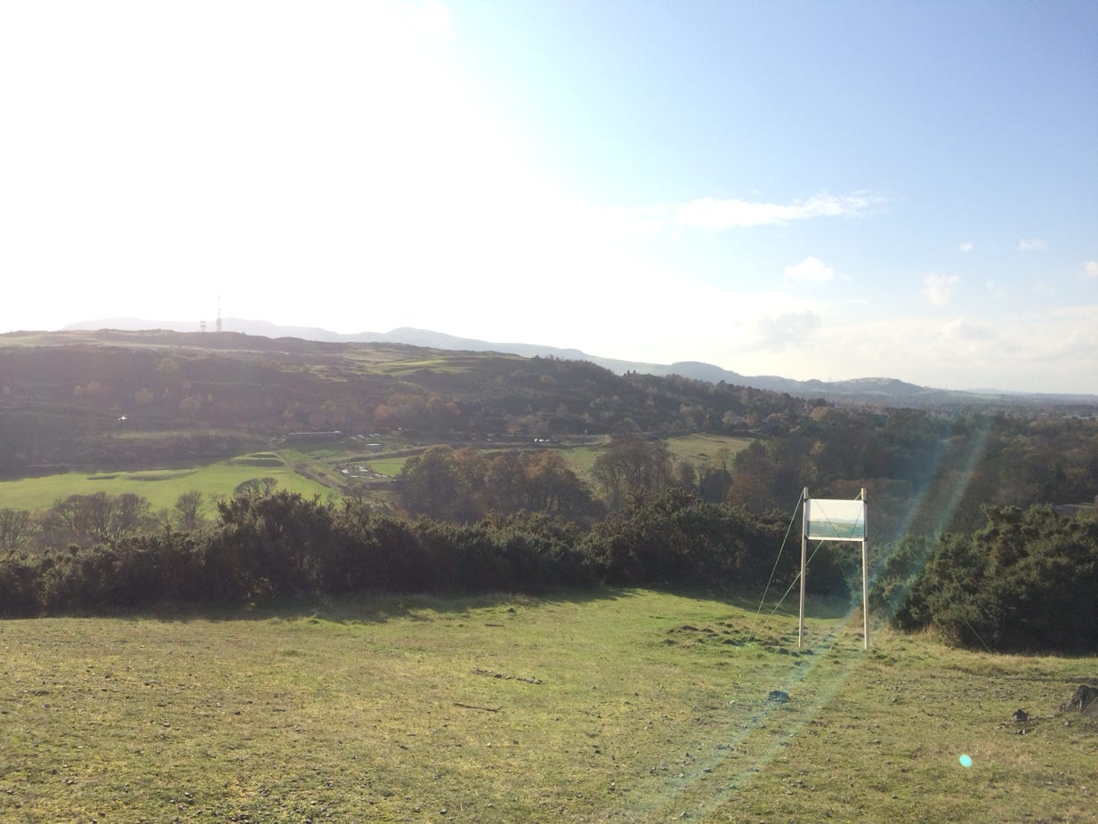 An Untitled Intervention was a temporary, site-specific installation made at the top of Blackford Hill. The installation consisted of a photo-manipulated landscape image of the opposite hill that depicted an alternative view to the one viewers saw themselves, creating a layering affect wherein the viewer saw and experienced the two landscapes simultaneously.