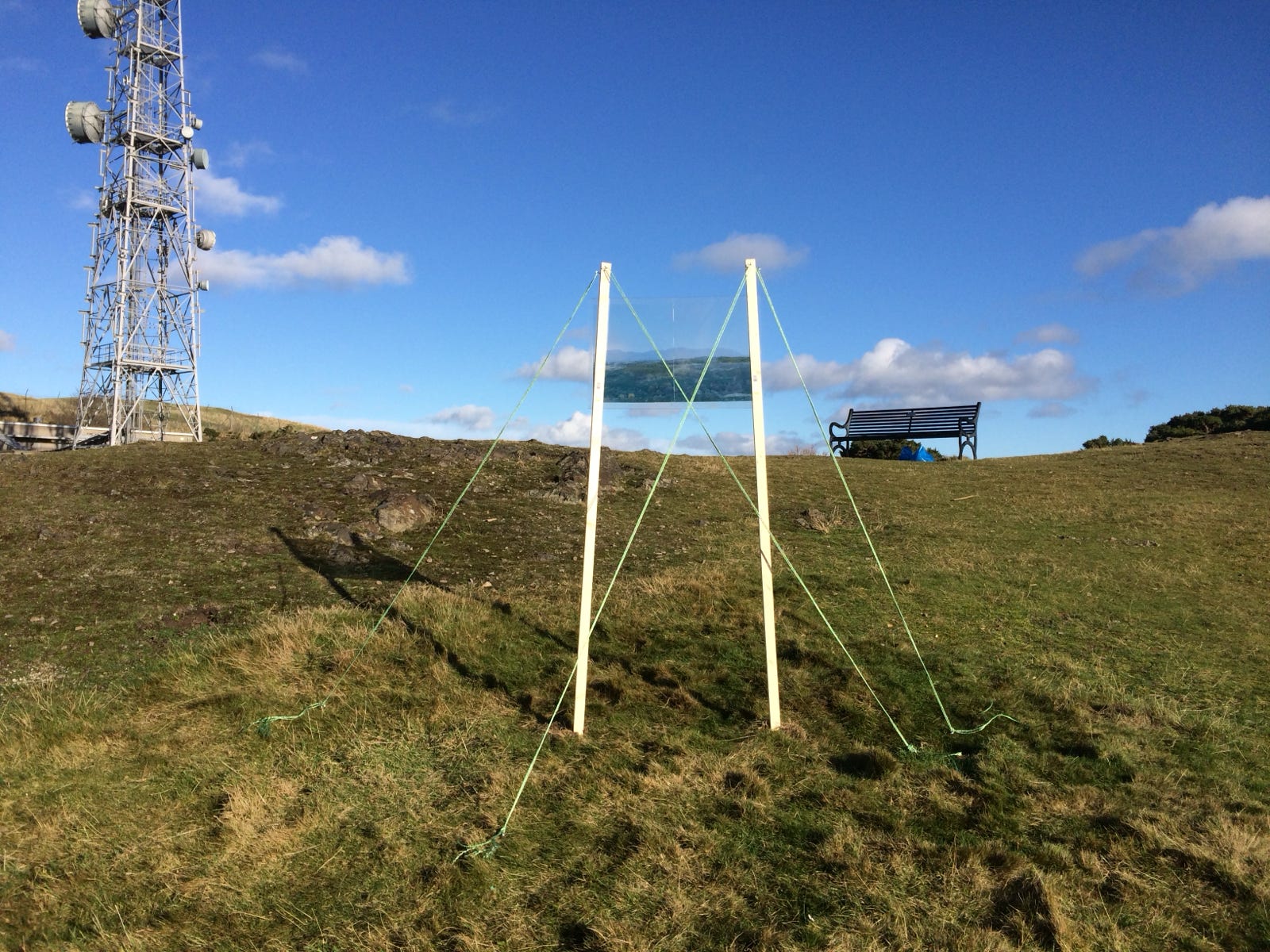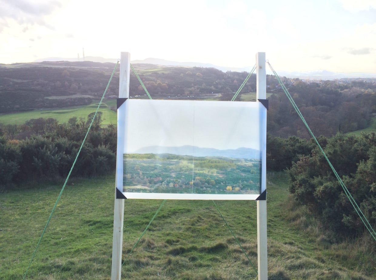 An Untitled Intervention was a temporary, site-specific installation made at the top of Blackford Hill. The installation consisted of a photo-manipulated landscape image of the opposite hill that depicted an alternative view to the one viewers saw themselves, creating a layering affect wherein the viewer saw and experienced the two landscapes simultaneously.